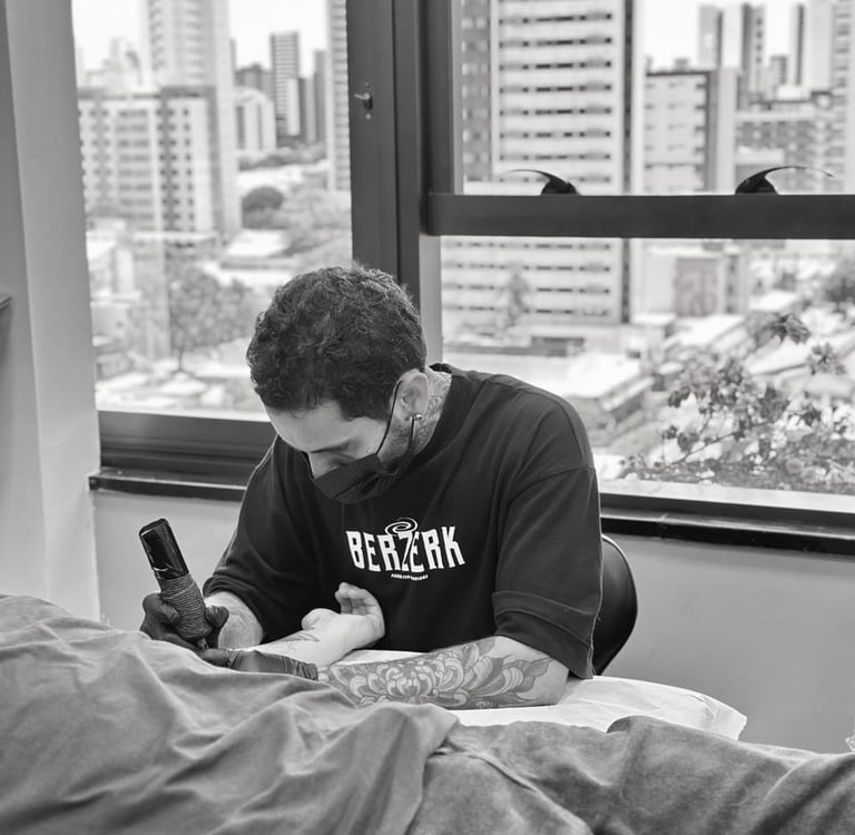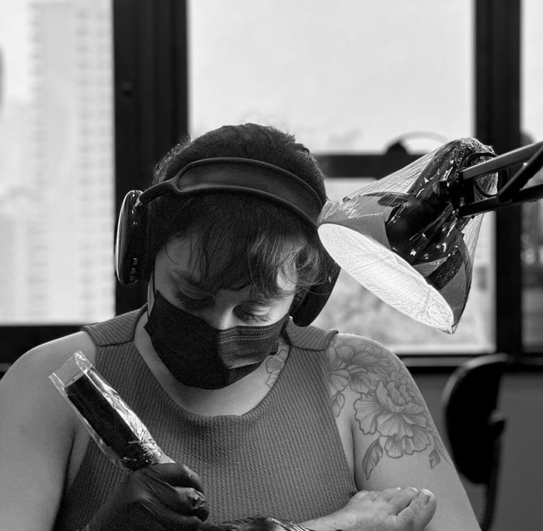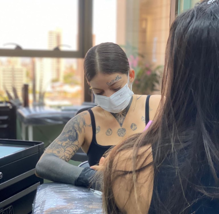 Tatuadora fine line e body piercing em Fortaleza, reconhecida pela delicadeza nos traços e pelo atendimento humanizado. Seu trabalho une estética minimalista, técnica refinada e acompanhamento profissional, proporcionando uma experiência segura, elegante e cuidadosamente planejada do início à cicatrização.